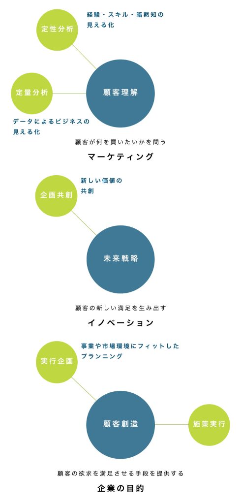私たちは、事業の価値は「顧客を知る」ことからスタートすると信じています。顧客がもたらすデータ(売上データ)の定量的な分析と、ワークショップで得られる現場担当者の経験に基づく洞察という定性的な知見の組み合わせによって、事業の未来像をお客さまと共に”想像”し、新しい価値の”創造”を後押しします。